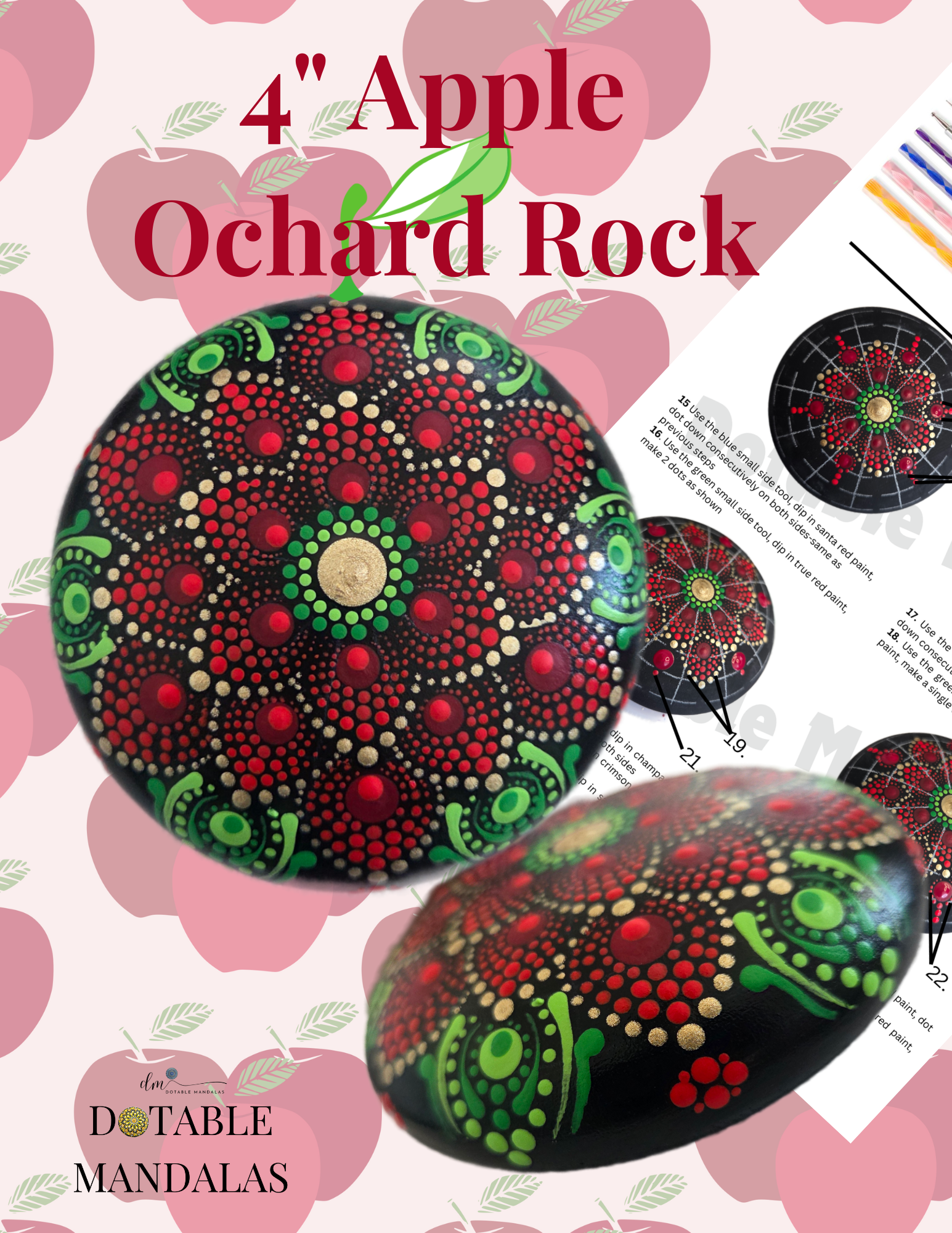 Celebrate the colors of autumn with the Apple Orchard Dot-Painting Pattern, now available as a convenient digital download! This printable PDF guide walks you step-by-step through creating a vibrant apple orchard-inspired mandala design on a 4" rock.
