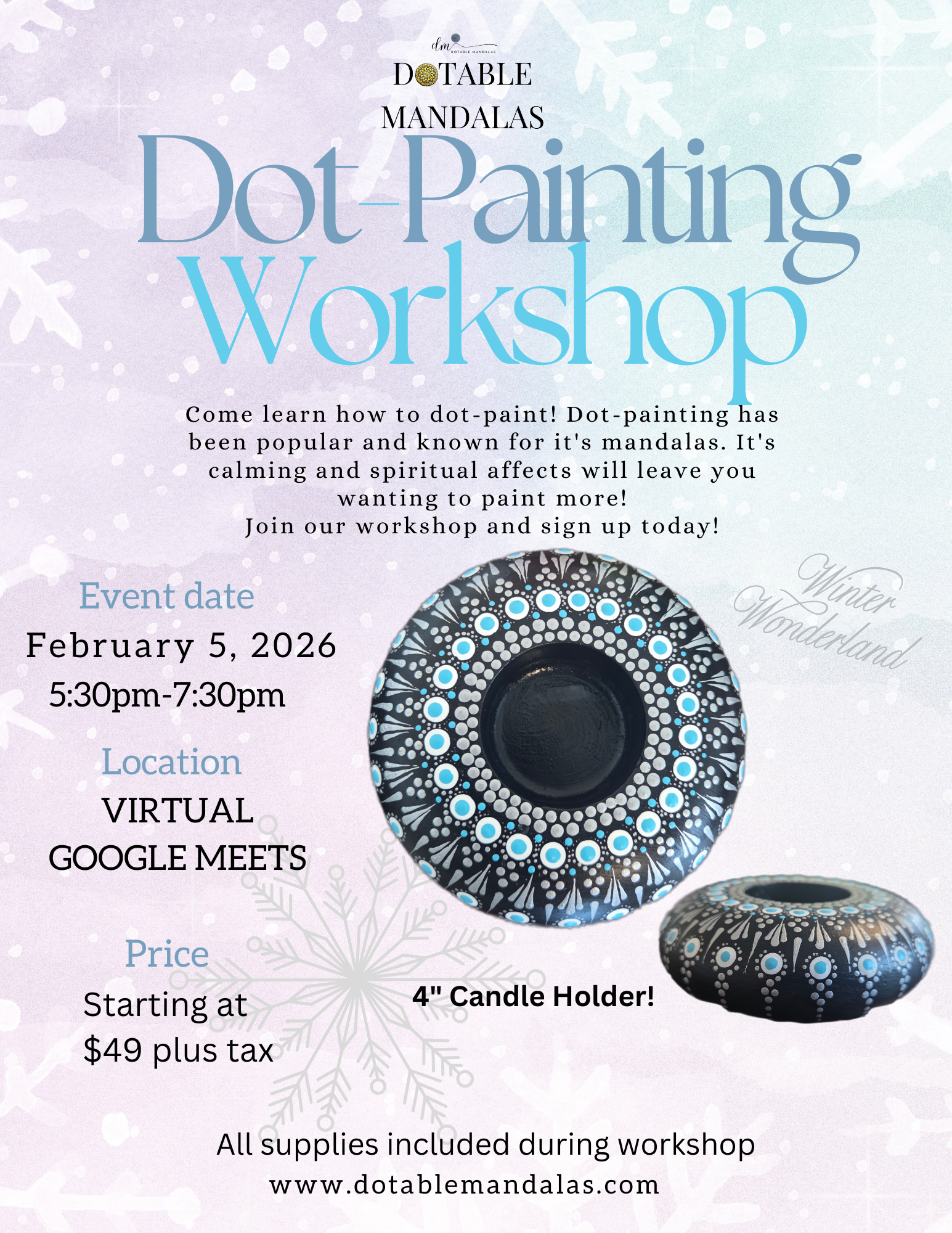 Step into a serene winter scene with our Winter Wonderland Candle Holder Virtual Workshop—a relaxing, creative experience perfect for the holiday season. In this guided session, you’ll transform a handcrafted holder into a shimmering winter décor piece using dot-painting techniques, soft seasonal colors, and your own artistic flair. No experience is needed!